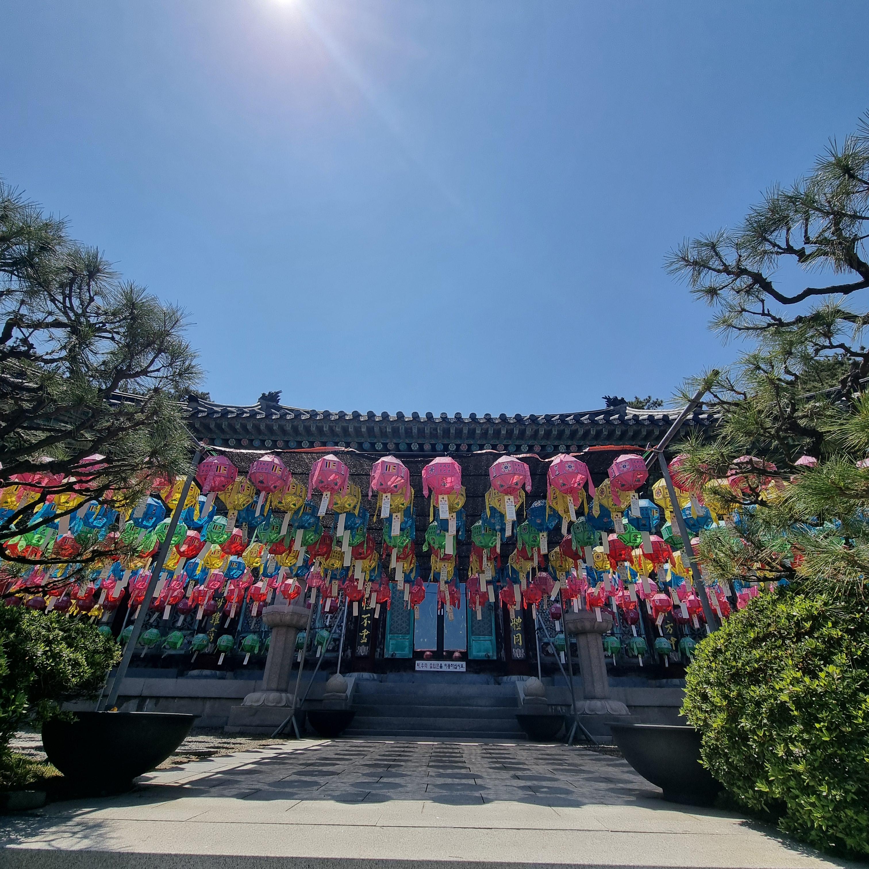 체크아웃을 마치고 집으로 돌아가는 길, 우리는 즉흥적으로 해동용궁사에 들르기로 했다. 아난티에서 차로 15분 남짓한 거리. 평일임에도 불구하고 많은 이들이 소원을 담은 연등을 하나하나 걸고 있었다. 계단을 따라 올라가자 오색찬란한 연등이 머리 위를 가득 수놓았고, 눈부신 햇살과 맞닿은 전각의 곡선은 그 자체로 한 폭의 그림 같았다.
